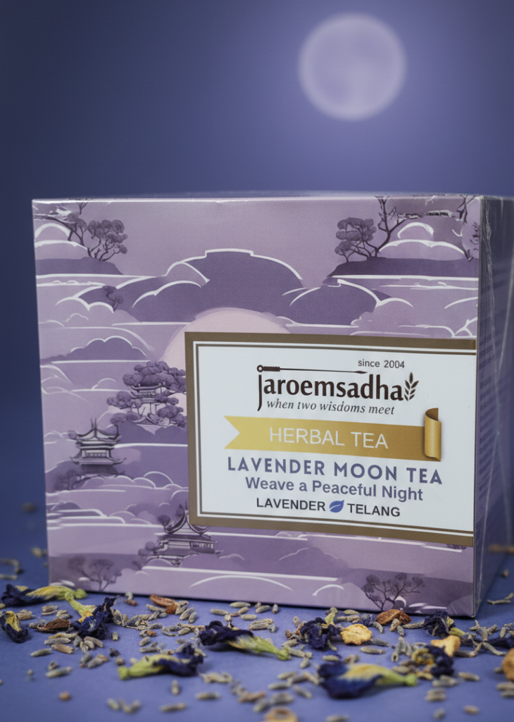 Lavender Moon Tea diracik dari Lavender yang dapat membantu menenangkan pikiran, meredakan ketegangan, dan mempersiapkan tubuh untuk tidur lebih nyenyak. Dan Telang (Butterfly Pea) untuk membantu menciptakan kondisi rileks sebelum tidur tanpa obat, tanpa ketergantungan.